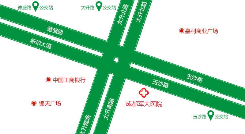 飞机场:乘坐机场2号线,在天府广场东站下车,转乘53路(或61路)在太升路口站下车,步行30米至成都军大医院。